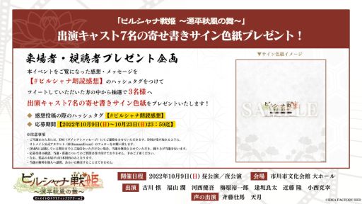 本イベントをご覧になった感想・メッセージを【#ビルシャナ朗読感想】のハッシュタグをつけてツイートしていただいた方の中から抽選で3名様へ出演キャスト7名の寄せ書きサイン色紙をプレゼントいたします。