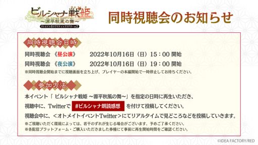 アイディアファクトリー株式会社(代表取締役社長:佐藤 嘉晃/所在地:東京都豊島区)の女性向けゲームブランド「オトメイト」より、2022年10月9日(日)開催予定のオトメイトドラマティックシアター vol.02「ビルシャナ戦姫 〜源平秋風の舞〜」につきまして、当日券の販売情報、来場者・視聴者プレゼント企画/同時視聴会のお知らせを公開致しました。