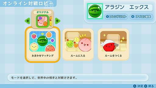 今回の無料アップデートでは,「オンライン対戦モード」を遊べるようになる。「おまかせマッチング」では世界中のプレイヤーとランダムに対戦可能で,特定の相手と対戦したいときは,ルームを作って相手を招待するか,相手の作ったルームに入る必要がある。対戦で選べるモードは,オフラインの2人プレイモードと同じく「オリジナル」「タイムリミット」「アタック」の3種類となる。