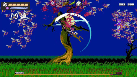 「朧一党(おぼろいっとう)」と戦う1人用の2Dプラットフォーマーだ。愛刀