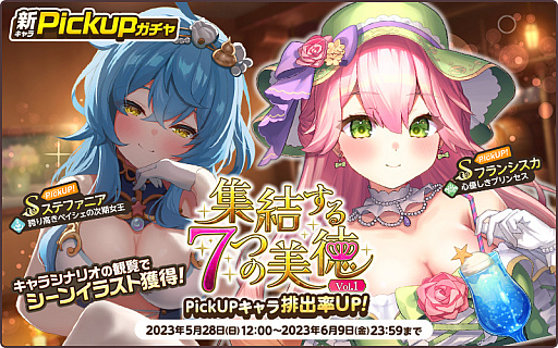 また,Sフランシスカ【心優しきプリンセス】やSステファニア【誇り高きペイシェの次期女王】などが登場する,PickUPガチャ「集結する7つの美徳Vol.1」が開催されている。