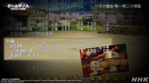 雨の日の練習のテキストも,センターのエラーをカバーしたシーンも,あくまでゲーム上のシステムであり“偶然”と言える。しかしそれらの偶然が,プレイヤーの見方によって大きなドラマとなる。ときは経ち,卒業を迎えた加藤。プロ入りは叶わず大学に進学した彼は,果たして大学でも野球を続けてプロを目指すのだろうか。ゲームの持つランダム性が,こういったプレイヤーの想像を描き立てるドラマと熱狂を生むわけだ。