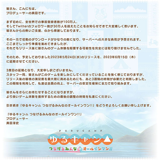 「ゆるキャン△ つなげるみんなのオールインワン!!」サービス開始後の満足度を最大限に高め、より快適にお楽しみいただけるよう、さらなる品質向上、サーバーの安定性確保を図るため、リリースを2023年6月15日(木)に延期することを決定いたしました。