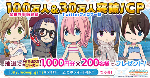 「ゆるキャン△ つなげるみんなのオールインワン!!」の全世界事前登録者数が100万人を超え、公式Twitterのフォロワー数が30万人を突破しました。熱いご支援、心から感謝申し上げます。