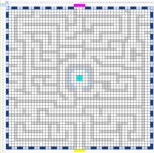 表計算ソフトを方眼にして,迷路の下書きを準備。あらかたできたら,実際に配置する作業へ取り掛かります。
