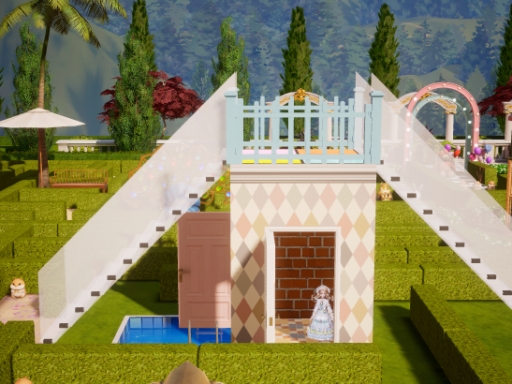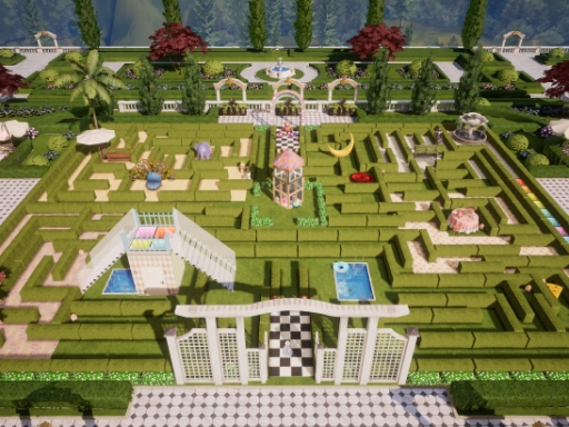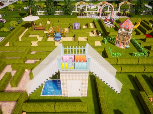 迷路の壁には装飾アイテムの生垣を使うことにしました。が,意外と背丈が低めで迷路の全貌が見えちゃう……。実在する庭園迷路の生垣は,大人の身長よりも高いくらいのようです。かといって,これより高い生垣は無し。困った末に