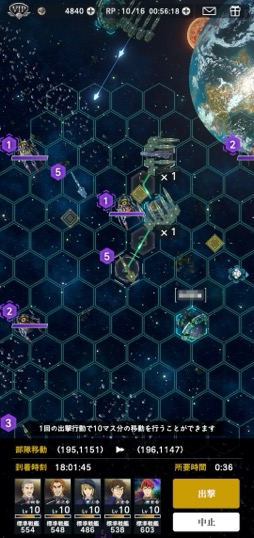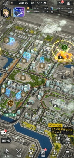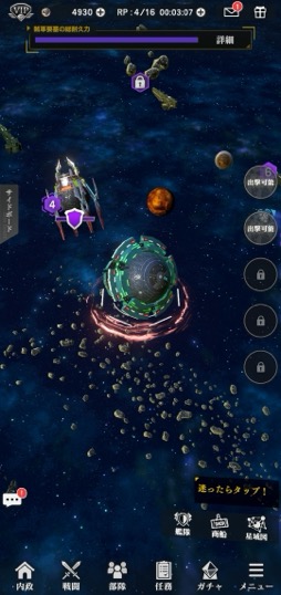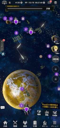 全体の流れとしては,資源の蓄積を待ちつつ拠点の施設と技術力を強化していき,その間に星域マップで演習部隊に挑戦。勝利後の入手アイテムで指揮官を強化し,さらに報酬が大きい上位の演習部隊や賊軍拠点を倒しつつ,より拠点の施設を強化していく……という形になりそうだ。