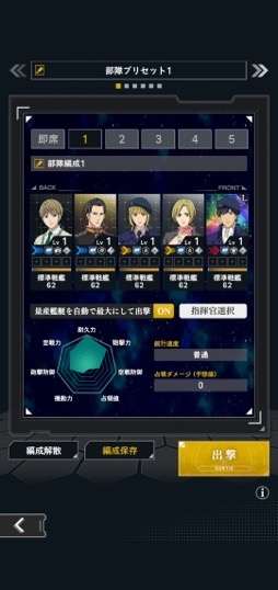 本作の部隊は「ガチャで入手した指揮官(キャラクター)に宇宙艦を配備する」という形で構成されるが,配備できる艦船の数は主に指揮官のレベルに比例して増加するため,基本的には「高いレベルのキャラに多数の艦船を指揮させるほど,部隊が強くなる」という仕組みになっている。
