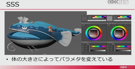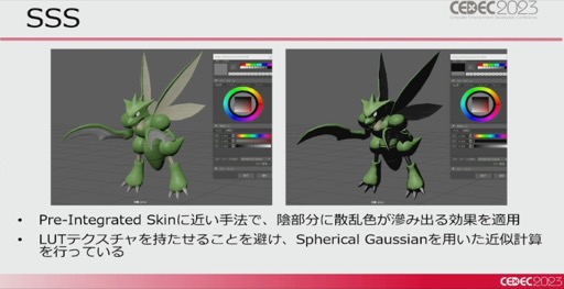 ポケモンの主な表現としてまず挙げられたのは,SSS(Subsurface Scattering)による陰影表現だ。この表現は体の大きさや密度などに合わせて,さまざまな設定で使い分けられており,ポケモンの個性に大きな影響を与えているようだ。