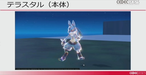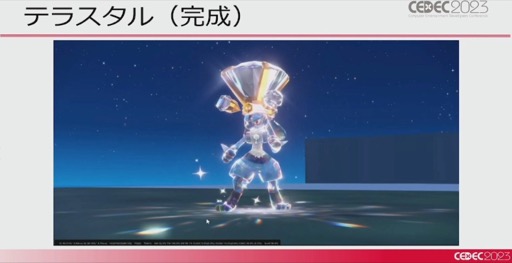 ほかにもジェルのような質感の出し方や,構造色の表現,パラドックスポケモンの粒子の表現などさまざまな手法が紹介されつつ,ポケモンSVの大きな特徴となっている「テラスタル」についても触れられた。