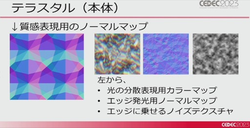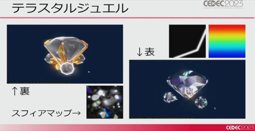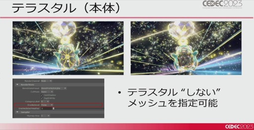 テラスタルでは,本体(ポケモン)部分については元々のモデルそのままにマテリアルを差し替え,ノーマルマップやカラーマップ,ノイズテクスチャを適用することで,宝石の質感を表現しているという。ただ,すべてを宝石化してしまうと見栄えが良くないため,テラスタル“しない”メッシュを指定できるようにもしているとのことだ。