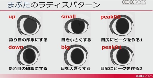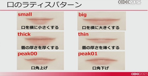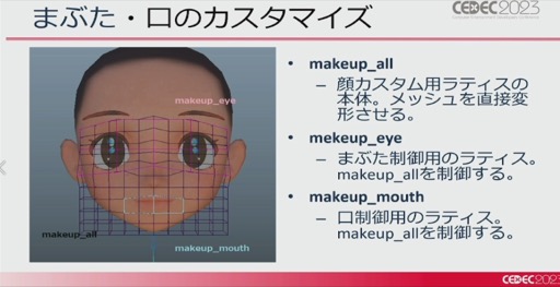 ポケモンSVでは主人公のキャラメイクで,つり目やたれ目,目の大きさなとを選べるが,これは,Mayaのラティス機能を使って作成されている。この機能を使って目尻の上げ下げや目の大小,口の大きさや唇の厚さなどの制御を可能にしたそうだ。ただ,すべてを細かくいじれるようにすると煩雑になってしまうため,それぞれの変形値の組み合わせをプリセットとして用意したとのこと。