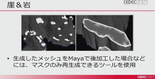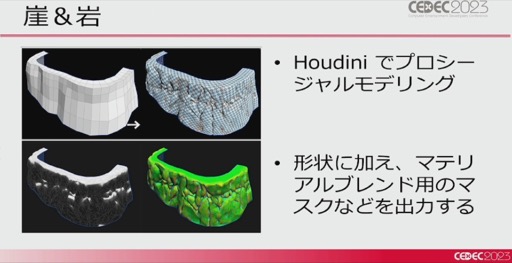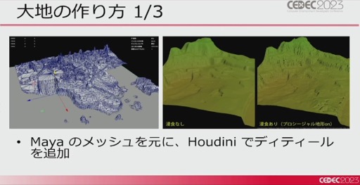 まずは大地(マップ)の作り方だ。パルデア地方の大地は,Mayaのメッシュを元にHoudiniでディテールを追加し,HightMapや質感を選択したり,草花を生やすためのMaskを出力したとのこと。また,それだけでは表現しきれないので,Houdiniでプロシージャルモデリングした崖や岩などを後から配置することで,地形を整えていったそうだ。