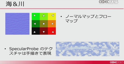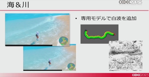 続いて海,川といった水辺の表現について。こちらは頂点アニメーションの動き,フローマップによる流れ,水深に応じた透明度の変化,スクリーンスペースの屈折表現を組み合わせ,基本的な処理を行っているという。さらに,波打ち際の白波を表現するため専用モデルを用意し,陸地に近いほど大きく変化するようにすることで“波打ってる感”を強調している。