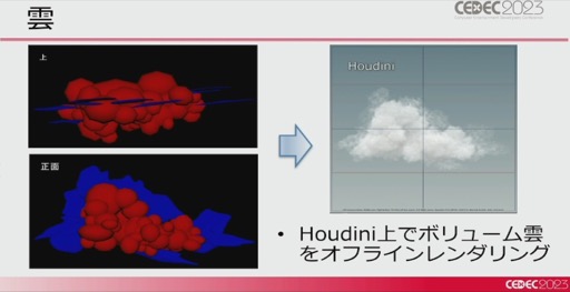 そして空は,水平線にグラデーションをのせるため,Precomputed Atmospheric Scatteringなどの先行技術をベースに表現。また,雲の表現として,モデリングした雲に6方向からライトを当てた結果を2枚のテクスチャにベイクし.実際の世界の光情報をもとに描画色を計算しているとのことだ。