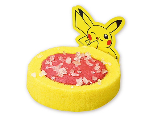 ピカチュウの赤いほっぺを表現したイチゴクリームをピカチュウのカラーをイメージした黄色いロール生地で包みました。トッピングのザラメは、ピカチュウが覚える技であるほっぺすりすりをイメージ。口の中でパチパチと弾けます。