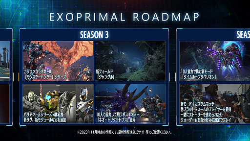 「エグゾプライマル」はシーズン制を採用しており,約3か月ごとに新たなコンテンツが追加されてきた。現在はシーズン2として「ストリートファイター6」とのコラボアイテムが登場しているが(関連記事),2024年1月18日の配信開始が予定されているタイトルアップデート第3弾では「モンスターハンター」シリーズとのコラボが始まる予定だ。
