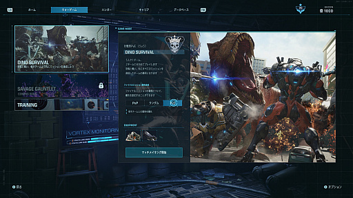 ファイナルミッションをPvP/PvE/ランダムの3つの種類から選んでマッチングすることができる「ファイナルミッション優先設定」を搭載。一部の例外はありますが、PvEを選んだプレイヤーはファイナルミッションにおいて「プレイヤーが操作するエグゾスーツとの直接的な戦闘が発生せず、ミッションのクリア速度で勝敗を競い合う」内容になる。毎回マッチング時に設定できるので、その時の気分にあったミッションで「ディノサバイバル」を楽しめる!