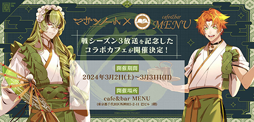 戦シーズン3の放送を記念して、マガツノート×cafe&bar MENUのコラボカフェを2024年3月2日(土)から開催いたします。コラボメニューや販売グッズの詳細については、続報をお待ちください。![]() |