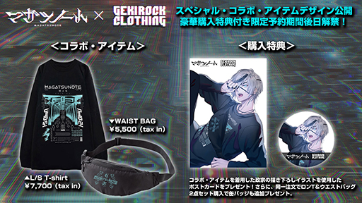 また,「激ロック」発のロックファッション特化型ショップ「GEKIROCK CLOTHING」とのスペシャルコラボアイテムのデザインと購入特典も発表された。ラインナップはロングスリーブTシャツ,ウエストバッグの2種で,価格は順に7700円(税込),5500円(税込)。受注期間は後日発表される。購入特典は,描き下ろしイラストを使用したポストカードと缶バッジで,コラボアイテム2種同時購入でもらえる。