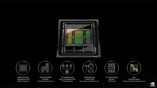 H100は,グラフィックスメモリに「HBM3」を採用しており,総容量は80GB,GPUとHBM3間のメモリ帯域幅は3TB/sに達するそうだ。冒頭に掲載したGPUパッケージの画像を見ると,GPUダイの上下に6つのHBM3スタックが見てとれよう。
