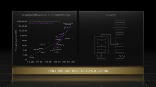 Transformerモデルは,自然言語処理以外にも応用されるようになり,NVIDIAによると,直近2年のAI系論文の70%がTransformerモデルに関するものになったというから,興味深い。