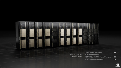 もう1つは,NVLink Switchを用いてDGX H100を32基相互接続することで,計256基のH100を搭載したスーパーコンピュータシステム「DGX SuperPOD with DGX H100」である。