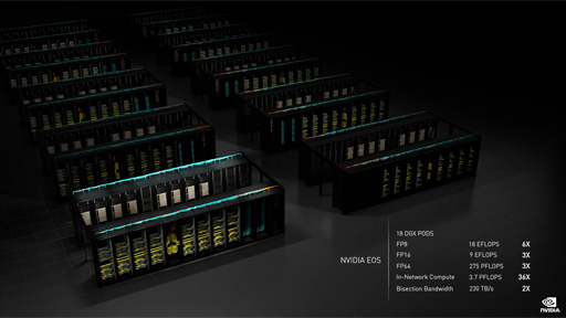 さらに,18台のDGX SuperPOD with DGX H100を,360基のNVLink Switchと500基のQuantum-2 InfiniBandスイッチで相互接続した巨大なスーパーコンピュータシステム「NVIDIA EOS」も発表した。NVIDIA EOSにおけるH100 GPUの総数は4608基となり,FP8で18 EFLOPS,FP64で275 PFLOPSという世界最速のAI開発向けスーパーコンピュータになるそうだ。