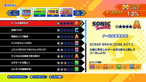 ご安心ください。本作ではスペシャルステージがリトライできるようになっています。本作にはリングとは別に「コイン」という概念がありまして,それを消費することで,スペシャルステージのリトライができます。コインはアニバーサリーモード内でリングを100個集めたり,1UPアイテムを取ったりなど,従来の1UPに該当する要素によって増やすことができるほか,ボスラッシュモードや,特定条件でのクリアに挑戦する「ミッションモード」などをプレイすることでも増やせます。