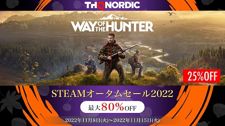 THQ Nordicは、Steam®にて販売中のタイトルが、最大80%OFFでお買い求めいただける「THQ Nordicオータムセール2022 第三弾」開催中です。狩りの季節が到来!大自然でリアルなハンティング『Way of the Hunter ウェイ オブ ザ ハンター』をはじめ、多数のタイトルがセール価格でお買い得です。