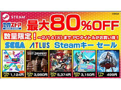 セガは,Steamで配信中のセガ/アトラスタイトルの対象タイトルのSteamキー(DLコード)が最大80%オフで購入できるセールをセガストアで開催している。期間は2023年2月14日23:59まで。期間中は,「LOST JUDGMENT:裁かれざる記憶」「ペルソナ5 ザ・ロイヤル」などのコードが割引価格で販売される。