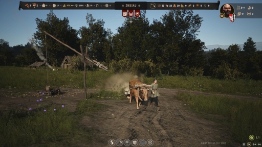 そう,史実では大規模な開墾や運搬の際に牛馬が大活躍したことを踏まえてか,「Manor Lords」にも労役専門の家畜として牛と馬が登場する。とくに最初から与えられる牛は,建設用の木材をひたすら運んでくれる非常にありがたい存在であり,集落発展はこの牛の働き次第と言っても過言ではない。