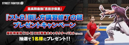 「霊長類最強・吉田沙保里の『スト6』キャラの倒し方講習映像」全4本の公開を記念し、第1弾の映像内で使用された「リュウ」のほぼ等身大パネルを抽選で1名様にプレゼント! なんと吉田沙保里さんのサイン入り! ぜひ応募して手に入れよう!