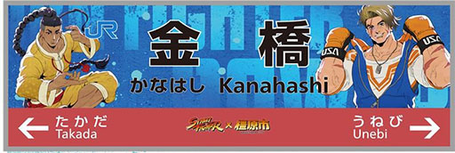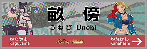 今回の発表に合わせて,各駅に設置される駅名標のデザインも公開された。登場するキャラクターは畝傍(うねび)駅はジュリとキャミィが,香久山(かぐやま)駅はケンとリュウが,金橋(かなはし)駅はジェイミーとルークとなる。