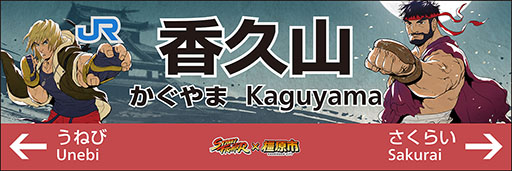その取組みの一環として、橿原市と包括連携協定を締結している株式会社カプコンの協力により、12月7日(土)から橿原市内の万葉まほろば線(桜井線)の3駅(香久山駅・畝傍駅・金橋駅)で、人気格闘ゲーム「ストリートファイター」に登場するキャラクターをデザインした駅名標を掲出します。