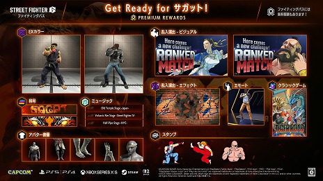 アバター装備「放浪者シリーズ」や,初代「ストリートファイター」の特徴的な動きを再現した「格闘家のステップ」のエモート,クラシックゲーム「虎への道」などを獲得できる。