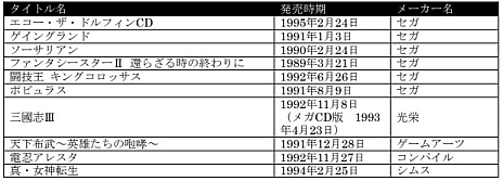 今回の発表では「エコー・ザ・ドルフィンCD」「ソーサリアン」「三國志III」「ポピュラス」「真・女神転生」などの10タイトルに加え,ボーナスタイトルとして日本初登場となる「ビューポイント」の収録が明らかになった。