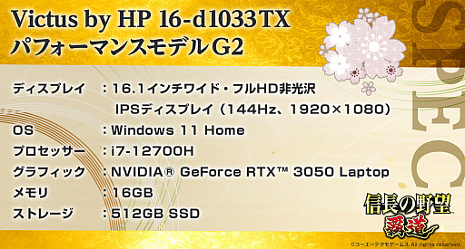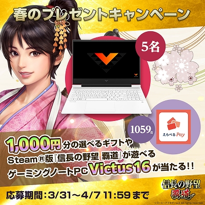 | ○概要 | 3月31日(金)から4月7日(金)11:59までの期間限定で、公式Twitter(@nobunaga_hadou)にて、1,000円分の選べるギフトコードを1059(戦国)名様に、日本HPのゲーミングノートPC「Victus by HP 16 d1033TX パフォーマンスモデル G2」を5名様にプレゼントするキャンペーンを開催いたします。 |