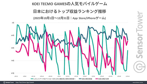 第4四半期に好調だった3タイトルは,トップ収益ランキングにもたびたび顔を見せている。日本におけるApp Storeのトップ収益ランキング推移を見ると,各タイトルが入れ替わる形で上位にランクインしている様子を確認できる。