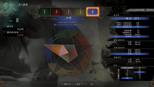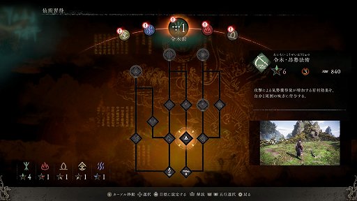 軍旗では,「木徳」「火徳」「土徳」「金徳」「水徳」という,五行に沿った能力の鍛錬が行える。木徳なら体力が,火徳なら近接攻撃力が上がるなど,それぞれで強化の方向性が異なる。また,どれを上げたかで習得できる「仙術」のアクションの種類が変わってくるほか,武器の攻撃性能の上がり方も変化するので,プレイスタイルに合わせて育成していくことになりそうだ。