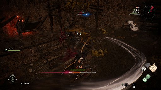 そしてもう1つ,より効果的な手段が「化勁」である。これは回避アクションであり,敵の攻撃が当たる直前に使うと,受け流して無力化し,さらに氣勢にもダメージを与える。とくに,敵が赤く光ってから放つガード不能攻撃を化勁で無効化すると,氣勢を大きく削げる。要はジャスト回避的な要素で,タイミングよく化勁を使い続ける限りこちらは無敵であり,逆に敵はボロボロになっていくという,凄まじい性能のアクションだ。もちろん,タイミングがズレると直撃を受けてしまうので,ハイリスクハイリターン。しかし,ボス戦においてはこれをうまく使わないとさっぱり氣勢が削げない。基本的に本作は,化勁で避け続けて戦うゲームと言っても過言ではないと思う。