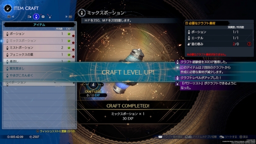 クラフトのレシピは,何度もクラフトをすることで上がっていくクラフトレベルやレポートをこなすことなどで入手できる。素材はフィールドや街中などの至る所に落ちており,この収集もいろいろな場所を巡るモチベーションの一つとなるだろう。とはいえ位置づけとしては「活用すると多少ラクになる」という程度で,一部のクエストアイテム作成を除けば,興味がないならスルーしても問題ない。