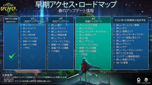 公開されたロードマップによると,バグ修正やパフォーマンスの向上,バランス調整などほぼ毎月行いながら,新しいコンテンツを加えるという頻度の高いアップデートが実施される予定だ。2025年2月19日(日本時間2月20日)にリリースされるアップデート第1弾では,新しいプレイヤーキャラクターや敵,キャラクターにパッシブスキルを加える「ホロバイト」などが実装される。