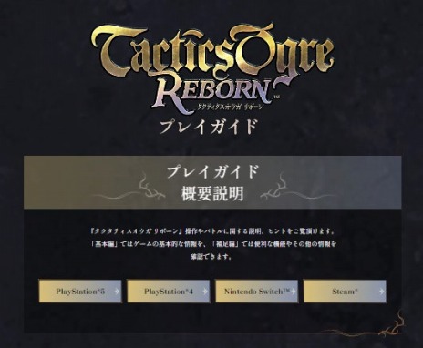 『タクティクスオウガ リボーン』のプレイガイドを公式サイトにて公開しました。各機種での操作方法やバトルに関する説明、ヒントをご覧頂けます。ゲームの基本的な情報を掲載した「基本編」と便利な機能やその他の情報を確認できる「補足編」となります。その他も前作よりレベルアップしたシステム情報やBGMなども更新!ぜひ公式サイトをご確認ください。