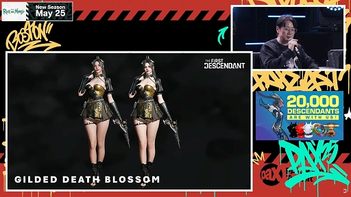ほかには,新スキン「ギルデッド・デス・ブロッサム」が5月22日にリリース予定であることや,1周年記念イベント「TFDフェス」が7月中に開催決定したことが発表された。
