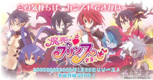大人気SRPG『魔界戦記ディスガイア』の歴代主人公たちとハラハラドキドキの学園生活を楽しめる恋愛アドベンチャーゲーム『魔界の♡プリンスさまっ♪』のリリースが200000002003年1月30日に決定いたしました!発売に先駆けてオープンした公式サイトでは、「界立ディスガイア学園」を舞台に繰り広げられる魔王凶育係“プリ子”と、彼女を取り巻く個性的な悪魔たちとの会話イベントや、イベントスチルの一部をご覧いただけます。