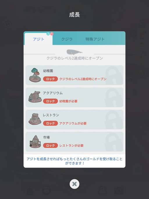 クジラの上では,釣り場やレストランなど,さまざまなアジトを開放でき,そのどれもがリアル時間の経過に応じて,アジトのレベルアップに必要なゴールドを生産してくれる。なお,ゴールドの生産量はアジトのレベルアップで増加する。