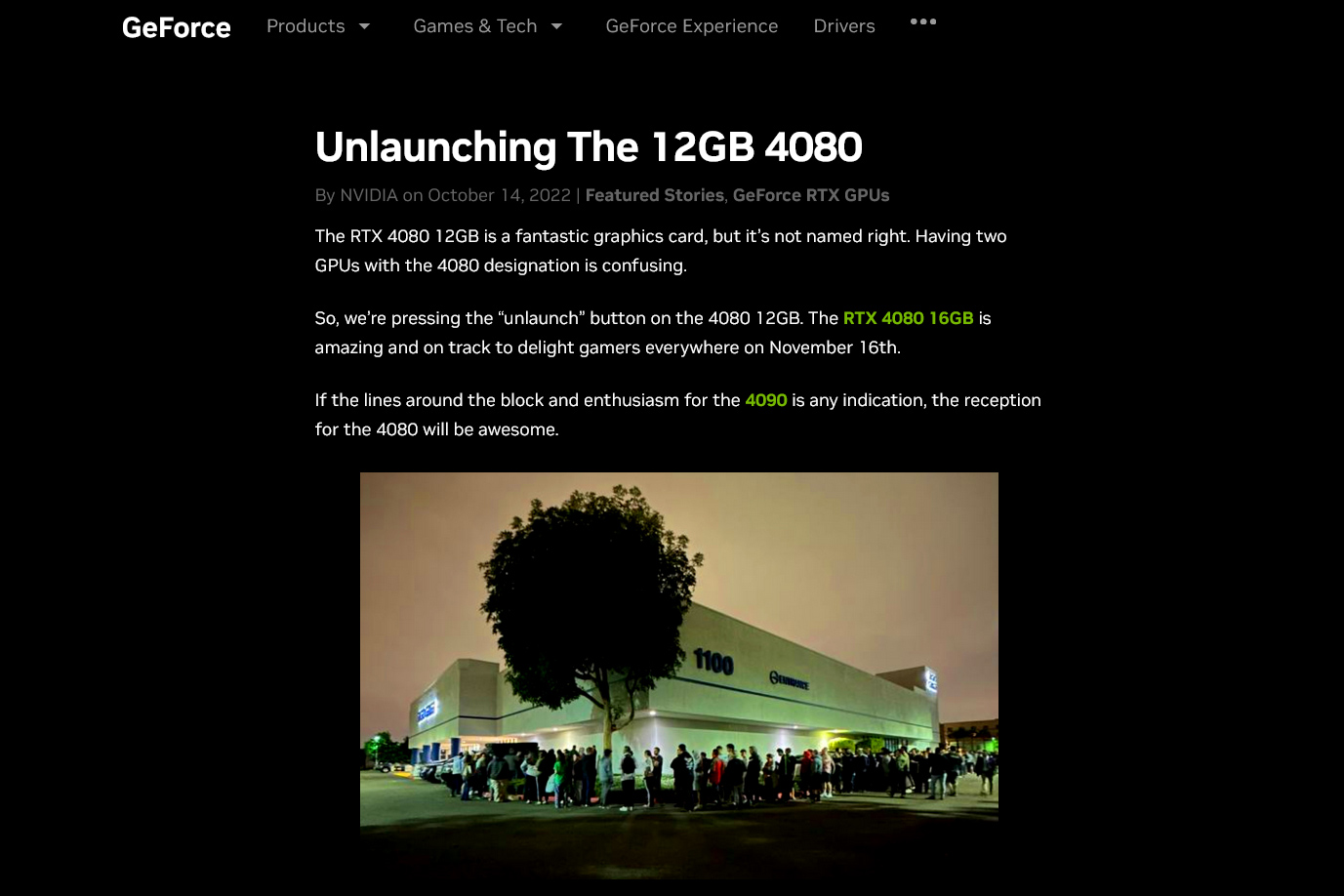 NVIDIA,GeForce RTX 4080 12GBの発売を中止。同型番に異なるモデルが存在することで混乱を招いたとのこと