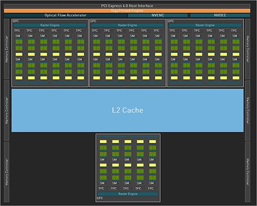 Ada Lovelaceアーキテクチャでは,GPUコアの種類に関わらず,シェーダプロセッサである「CUDA Core」を128基と,L1キャッシュメモリやテクスチャユニット,そしてレイトレーシングにおける光線の生成と衝突判定を行う「RT Core」を1基,さらに行列積和算に特化した「Tensor Core」を4基まとめて「Streaming Multiprocessor」(以下,SM)を構成している。