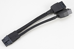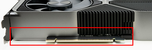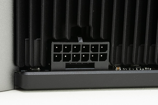 補助電源コネクタは,カード中央付近の側面に16ピンを1基備える。先述したように,2本の8ピンを16ピンに変換するコネクタが付属しているが,TGPが200Wであるなら,かなりのオーバースペックのようにも思われる。このあたりは,電力供給に関してかなりの余裕を持たせたということなのだろうか。